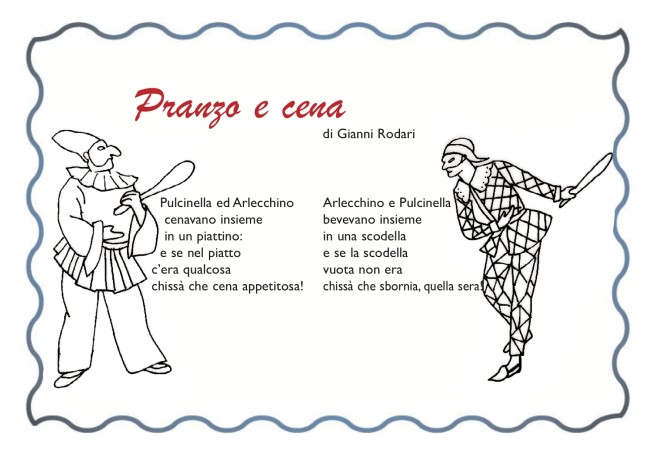 Una poesia per bambini sul Carnevale di Gianni Rodari, una filastrocca che ci racconta di una cena in un piattino con Pulcinella ed Arlecchino.