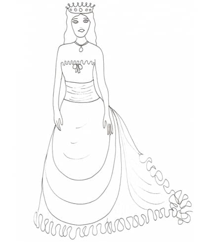Principessa con coroncina da colorare Disegno di una principessa in abito da ballo, con una coroncina d’oro, da stampare e colorare. Cliccare sul disegno per stamparlo: