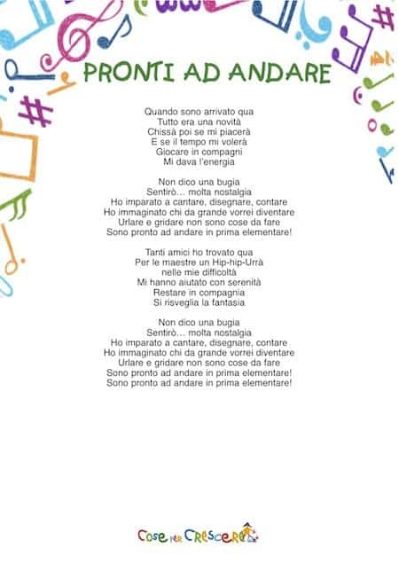 Una canzoncina per la fine della scuola, in particolare per i remigini che sono arrivati alla fine del ciclo della scuola dell’infanzia e a settembre, inizieranno la prima elementare. Pronti ad andare è una canzone per bambini facile da imparare di cui proponiamo il video dei Laboratori di Musica preso da Youtube, il testo da leggere online per cantarla e, scorrendo la pagina sempre più in basso, da stampare gratuitamente per impararlo!