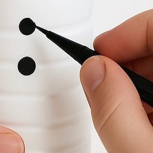 Usa un pennarello nero o un pennello per disegnare tre bottoncini sul corpo del pupazzo, sempre sulla parte frontale della bottiglia. I bambini più grandi possono farli da soli; i più piccoli possono essere aiutati da un adulto.