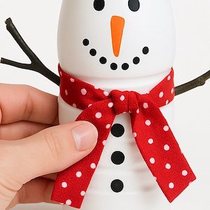 Annoda intorno al “collo” una striscia di stoffa o un nastro colorato. Una sciarpa rossa a pois, come nell’esempio, è perfetta per dare un tocco allegro e invernale.