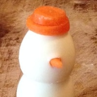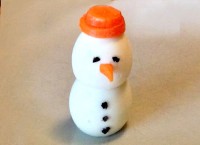 • Ritagliare un piccolo cono nella carota per fare il naso. Infilarlo sul viso del pupazzo.