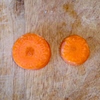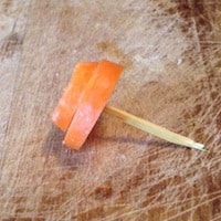 • Tagliare 2 rondelle di carota di dimensioni diverse (più grande e più piccola) e infilarle in uno stuzzicadenti.