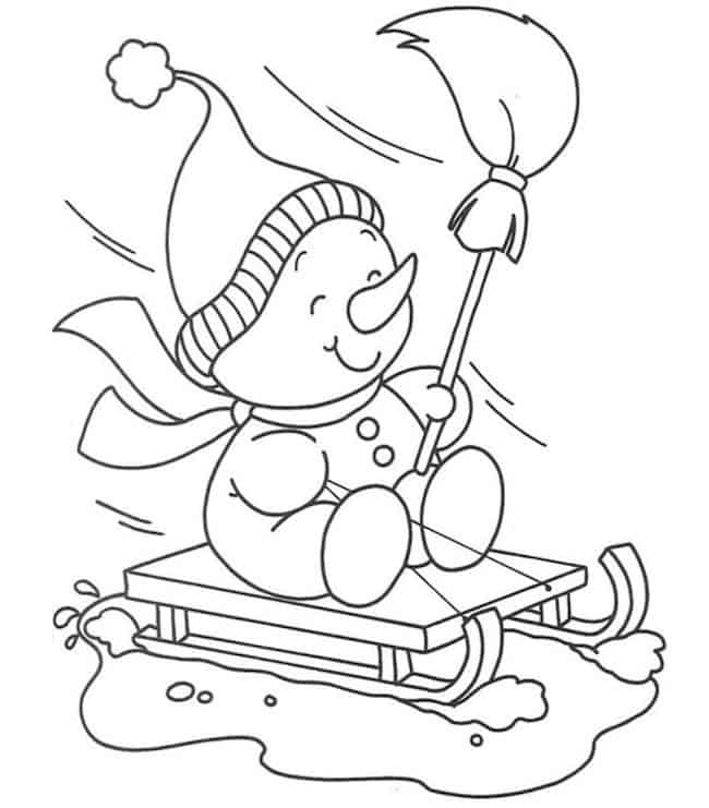 Il nostro pupazzo di neve da colorare indossa un morbido berretto di lana, una sciarpa colorata e tiene in mano una scopa — forse quella della Befana? — mentre scivola allegro su una slitta tra i fiocchi di neve. È un soggetto semplice ma ricco di dettagli che stimolano la fantasia e la coordinazione dei bambini.