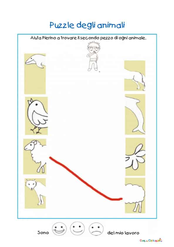 Un semplice puzzle degli animali per bambini piccoli. Questo puzzle si presenta come una scheda didattica: i bambini dovranno osservare il disegno e assemblare le parti in modo corretto per ricomporre gli animali. I diversi elementi possono essere collegati con una matita o ritagliati e assemblati.