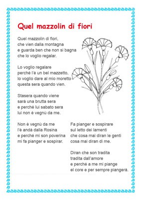 Canzone e testo del famoso canto alpino “Quel mazzolin di fiori” per cantare con i bambini. “Quel mazzolin di fiori”, racconta l’amore di una ragazza verso il suo amato che l’ha tradita. Potrete stampare una versione della canzone da dare ai bambini, per cantare tutti insieme. I bambini potranno colorare il disegno, finendo così di illustrare la scheda della canzone e raccogliere tutte le nostre schede da riunire in un personale libro delle canzoni.