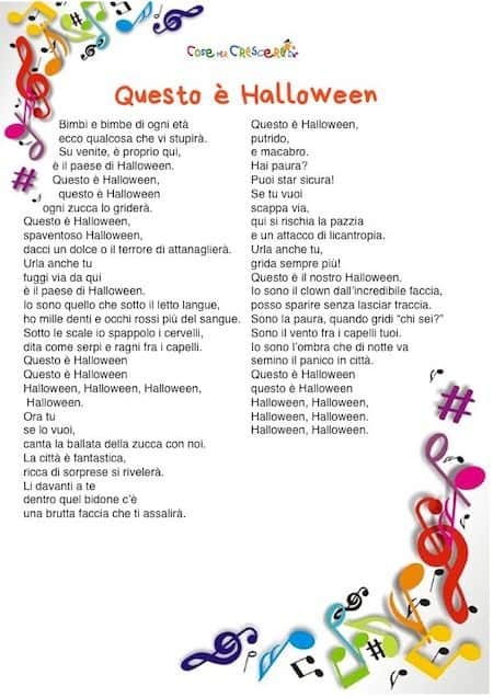 Questo è Halloween è la famosa canzone tratta dal film d’animazione Nigthmare Before Christmas, una paurosa storia per bambini! Proponiamo la canzone nella sua versione italiana con il video tratto da Youtube, il testo da leggere online e da scaricare e stampare gratuitamente (scorrendo la pagina verso il basso). Per impararlo e cantarlo insieme!