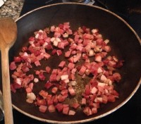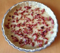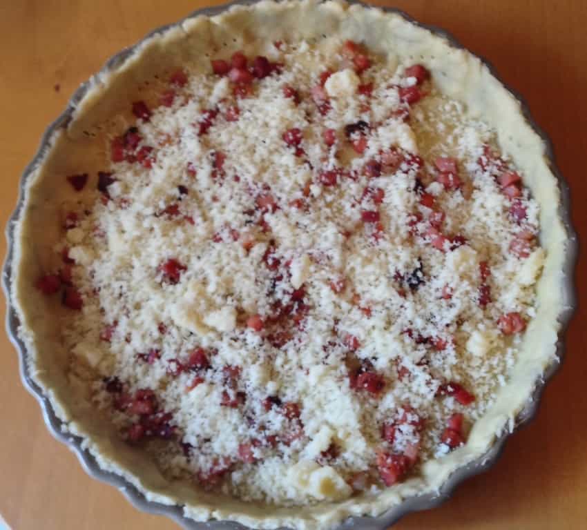 - Aggiungete il formaggio emmental grattuggiato sui dadini di pancetta, ricoprendo il fondo di pasta (facoltativo).