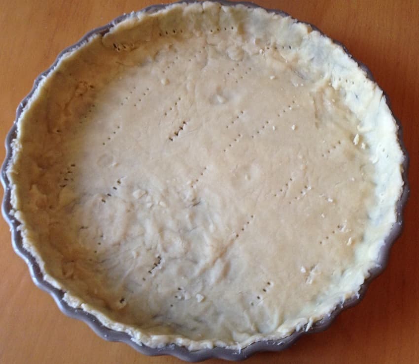 - Stendete la pasta brisée su un piano di lavoro infarinato, avvolgetela su un mattarello e stendetela in una teglia da forno. Eliminate la pasta in eccesso dai bordi, aiutandovi con un coltellino o con una rotella tagliapasta. Bucherellate la pasta con una forchetta.
