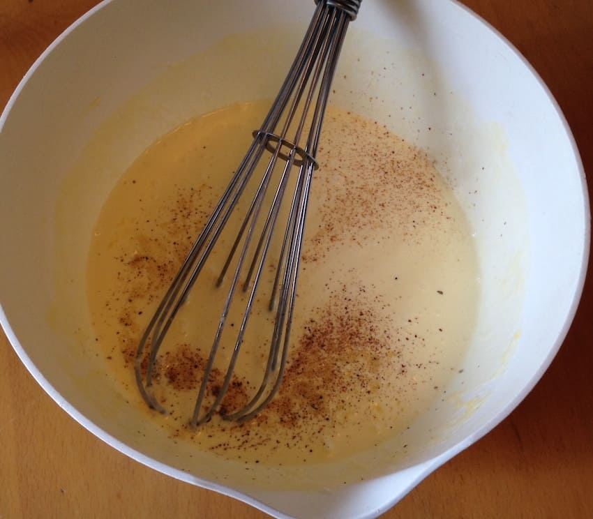 - In una ciotola, sbattete le uova con la panna. Aggiungete sale (non troppo perché pancetta e formaggio sono salati), pepe e un pizzico di noce moscata. Amalgamate il composto.