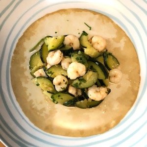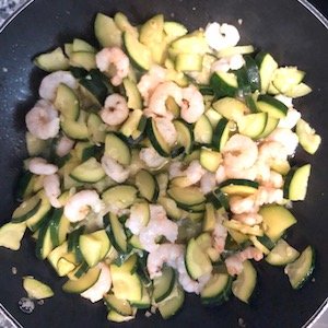 - Continuare la cottura finché le zucchine non saranno diventate tenere, poi aggiungere i gamberetti sgusciati e già puliti.