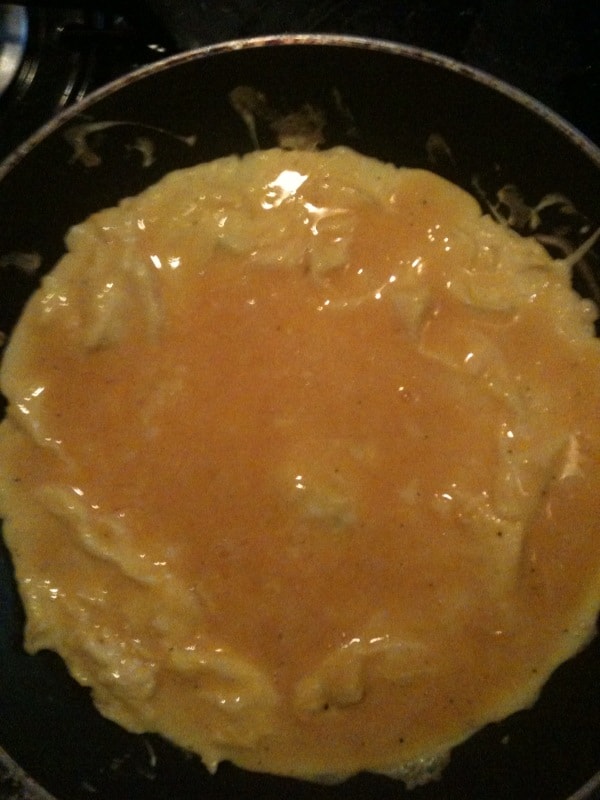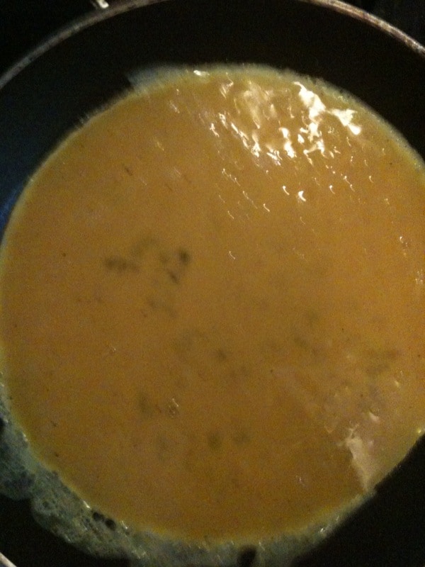 • Sciogliere un pezzetto di burro o un pò d’olio extravergine in una padella antiaderente e versare il composto con le uova.
