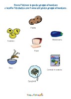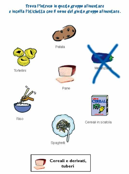- Chiedete al bambino di ritagliare le etichette dei gruppi alimentari, scegliere quella corretta e incollarla sulla scheda.