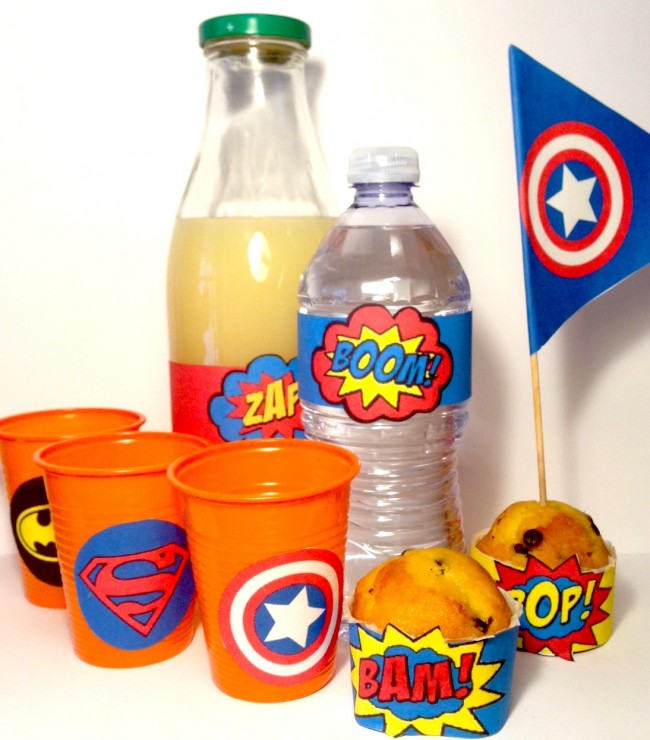 Come? Sostituendo le etichette delle bibite (o delle bottigliette d’acqua) con etichette da supereroi, incollare segna-bicchieri per super eroi sui bicchieri di carta (ognuno potrà scegliere il suo), ricoprendo muffin o cupcake con delle fasce di carta a tema e preparare una serie di super bandierine da usare come festone o da infilare nella torta, nei dolcetti o nei panini (clicca qui per stamparle).