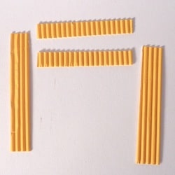 - Nel cartoncino ondulato, disegnare e ritagliare 2 rettangoli di 8 cm x 1,2 cm e 2 rettangoli di 6 cm x 1,2 cm.