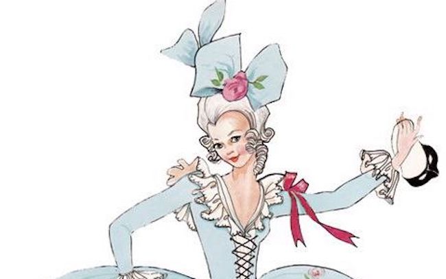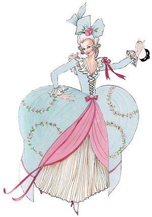 La ragazza indossa un abito blu, stretto in vita da nastri, i capelli sono biondi, sempre ben acconciati e arricchiti da gioielli e fiocchi di vario colore, inoltre porta con sé un ventaglio rosa.
