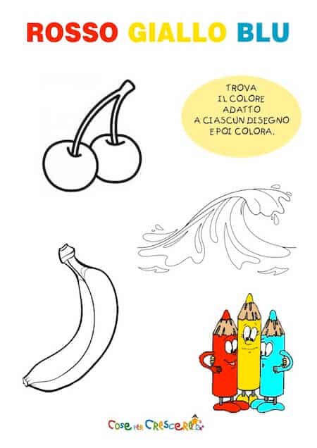 Esercizio sui colori ludico e divertente da proporre ai bambini della scuola dell’infanzia che seguono un percorso di apprendimento dei colori primari. I bambini dovranno osservare i disegni e colorarli con il colore più adatto tra i tre colori proposti: rosso giallo o blu!