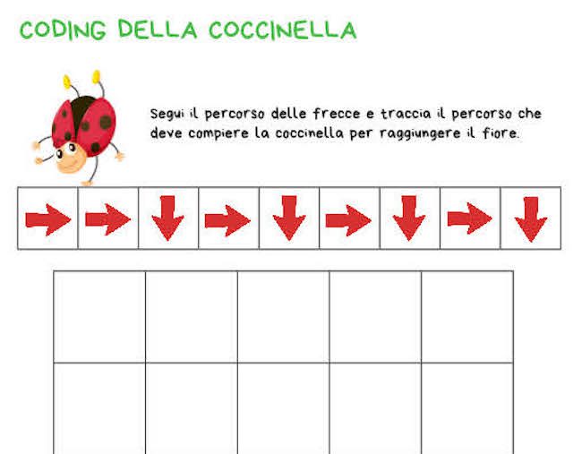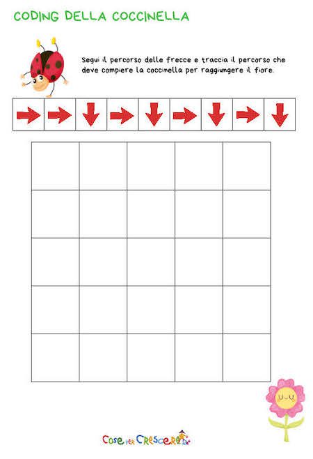 La primavera è arrivata e la nostra simpatica coccinella ha bisogno del tuo aiuto per raggiungere il fiore! Con questa divertente scheda di coding da stampare, i bambini della scuola primaria e dell’infanzia potranno allenare il pensiero logico e seguire un percorso tutto da scoprire… usando solo le frecce! 🎯✨