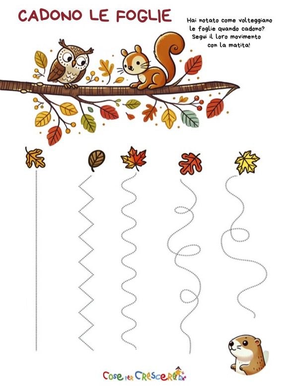 In questa scheda sull’autunno per la scuola dell’infanzia, i bambini devono seguire con la matita il percorso delle foglie, che cadono con traiettorie diverse: alcune linee sono dritte, altre zigzaganti o curve. Questo stimola i bambini a riconoscere e riprodurre differenti tipi di tracciati, ampliando la loro capacità di percepire i movimenti nello spazio.