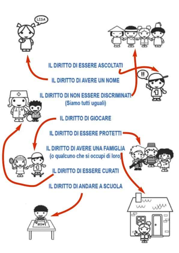 – come protezione, salute, istruzione, gioco, uguaglianza – attraverso illustrazioni da collegare e colorare.