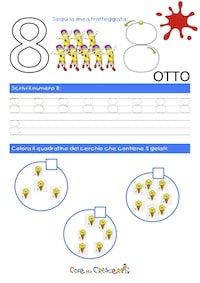 Schede di pregrafismo per imparare a scrivere i numeri, per i bambini della Scuola dell’infanzia. In ogni scheda, il bambino è inviato a colorare il numero, imparare a scriverlo in grande seguendo una linea tratteggiata, esercitarsi fino a scrivere il numero senza aiuto e giocare a identificarne il valore. Per stampare le schede da 1 a 9, basta scorrere l’articolo verso il basso e inserire l’indirizzo mail dove segnato.