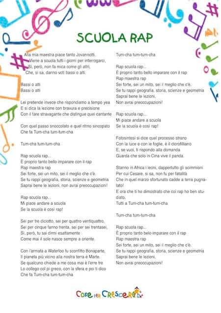 Scuola rap è una canzone per bambini allegra e divertente, per sorridere e giocare, che si canta ovviamente a ritmo di rap! Vi proponiamo sia la versione in video (da youtube) che il testo da stampare gratuitamente (a fondo pagina).