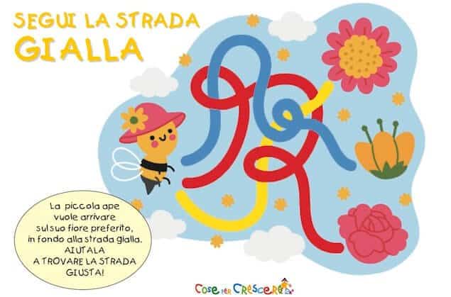 Un modo ludico e divertente per aiutare i bambini più piccoli a riconoscere e memorizzare i colori. Si può chiedere al bambino di seguire il tragitto con il dito o di tracciarlo con una matita, seguendo la linea gialla. Linea che dovrà ovviamente individuare da solo.