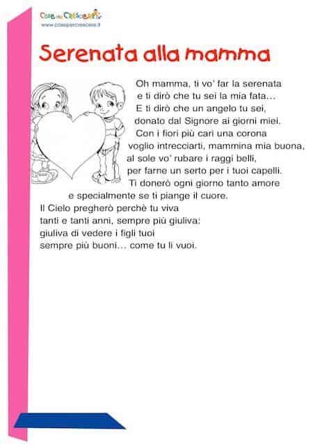 Una poesia per la Festa della mamma, un Serenata alla mamma, da dedicarle per festeggiarla. Una dolcissima poesia adatta ai bambini che frequentano la scuola primaria.