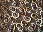 - Arrotolare la pasta sfoglia, stretta, da entrambi i lati facendo in modo che i due rotoli si congiungano a metà. Schiacciare leggermente con le dita in modo da unirli.
