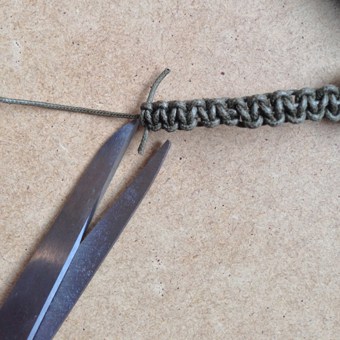 - Tagliare il filo dei nodi in eccedenza, rigirarlo all’interno degli ultimi nodi e fissarlo con un punto di colla. Non tagliare il filo di mezzo.