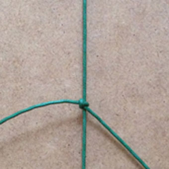 - Piegare a metà il filo lungo 1,20 m per individuare il punto che si trova a metà e annodarlo al filo fissato sul tavolo, a circa 10 cm dall’alto. Il filo fissato al tavolo serve da “colonna vertebrale”, l’altro serve a fare i nodi.