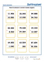 Una scheda per esercitarsi a risolvere sottrazioni entro il 99.999 da stampare e da dare ai bambini di quarta elementare o ai bambini di quinta che necessitano di un piccolo ripasso.