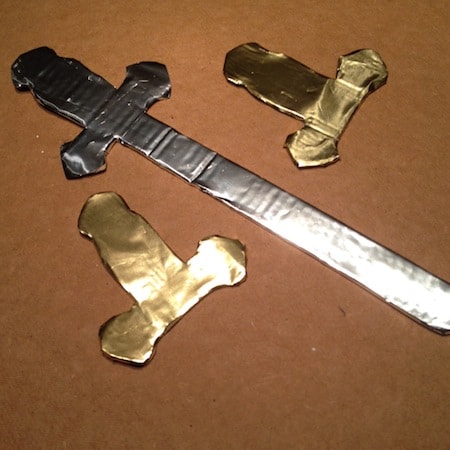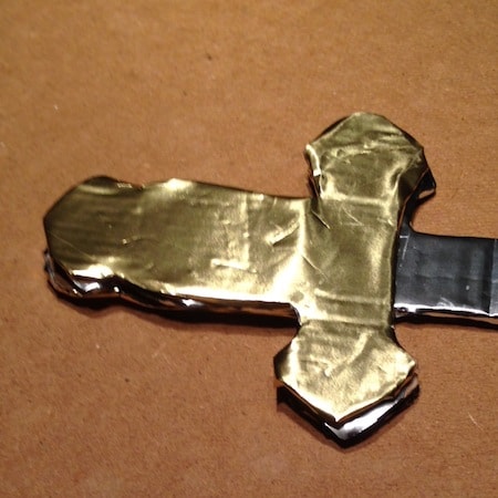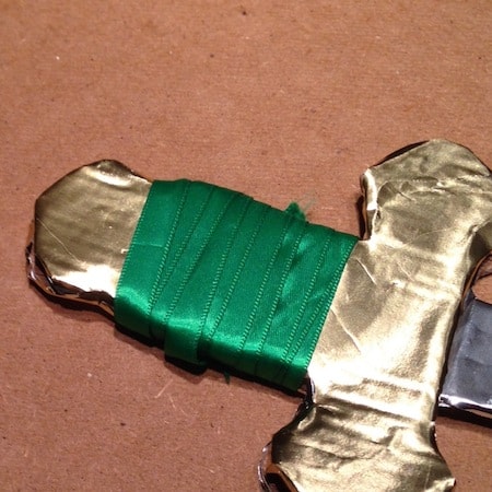 - Incollare le due impugnature dorate su entrambi i lati dell’impugnatura della spada. Avvolgere il manico con un nastro colorato (o della lana).