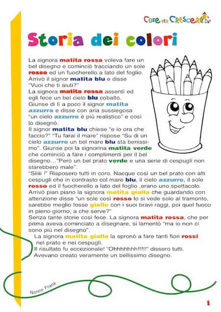 Una bella storia dei colori per bambini della scuola dell’infanzia da raccontare per aiutare i bambini a riconoscere i colori in modo ludico e divertente. Una testo scritto dal simpatico Nonno Frank che abbiamo impaginato con un disegno da colorare e dando alle parole il colore che indicano. Un modo perché i bambini riescano ad associare parola e colore.