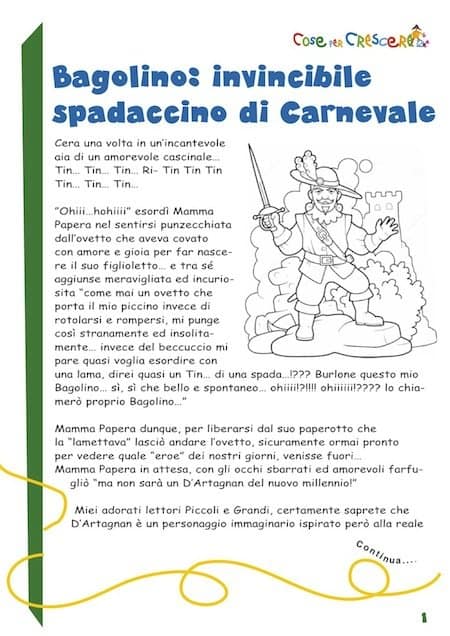 Vi proponiamo una bellissima e divertente storia di Carnevale per bambini, la storia di Bagolino, invicibile spadaccino di Carnevale, una favola allegra e simpatica che è decisamente piaciuta a tutti i bambini.