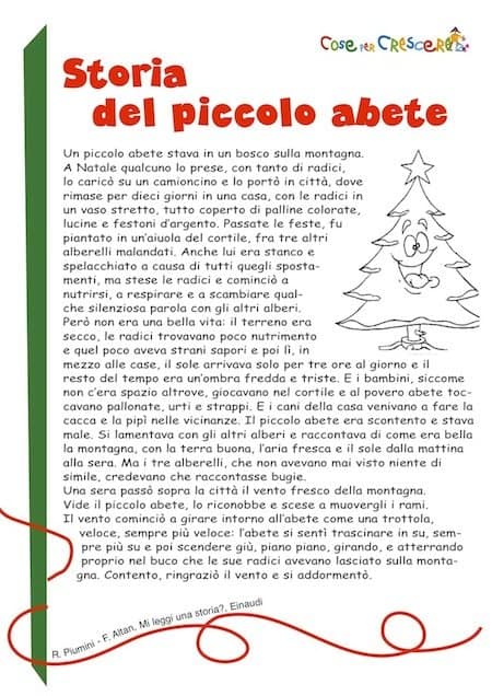 La storia di un piccolo abete (R. Piumini – F. Altan, Mi leggi una storia?, Edizioni Einaudi) da raccontare ai bambini nel periodo natalizio o da usare a scuola come lettura o dettato ortografico. Abbiamo anche preparato una versione della storia da stampare gratuitamente, illustrata con un disegno che i bambini potranno colorare, se lo desiderano.
