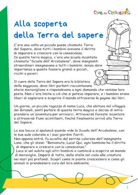 Alla scoperta della Terra del sapere è una storia per bambini sul diritto all’istruzione, una storia magica e avvincente, adatta ai bambini della scuola primaria e della scuola dell’infanzia. Racconta di Luca, un ragazzo che scopre una terra incantata chiamata Terra del Sapere, dove ogni bambino ha il diritto di imparare e crescere con la conoscenza. Attraverso avventure entusiasmanti e incontri straordinari, Luca scopre l’importanza dell’istruzione e decide di fare la differenza nel mondo.