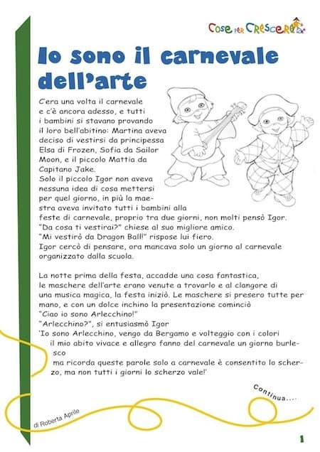 Per stampare la storia “Io sono il carnevale dell’arte, illustrata con disegni da colorare, scorri la pagina verso il basso e clicca sull’immagine dove segnato. Si aprirà una seconda finestra, con la storia di Carnevale, pronta per essere scaricata e/o stampata.
