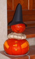• Appoggiare la zucca patisson a forma di colletto, sulla zucca più grossa. Appoggiare al zucca/testa sopra alla zucca patisson. Per dare più stabilità alla strega, potete appiattire (limando o tagliando) i due lati della zucca patisson oppure fissare le zucche con degli stuzzicadenti.
