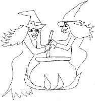 Streghe con calderone da colorare: disegno per bambini Disegno di due brutte streghe che stanno preparando una pozione magica in grande calderone, da stampare e colorare. Cliccare sul disegno per stamparlo: