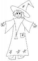 Disegno da colorare per bambini: una streghetta molto carina e dall’aspetto sorridente e simpatico, con il suo bel cappellone a punta ed il suo lungo vestito coperto di stelle.