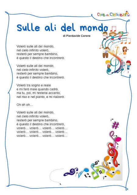 “Sulle ali del mondo” è la sigla del cartone animato “Le nuove avventure di Peter Pan” cantata Pierdavide Carone. Una canzone che è un inno all’avventura, un invito a cercare nuove esperienze, perfetta come canzone di fine anno scolastico e adatta sia ai bambini della scuola primaria che ai bimbi della scuola dell’infanzia. Proponiamo il video per ascoltarla, il testo da leggere online e da stampare gratuitamente per cantarla insieme! Per stampare il testo della canzone, scorri la pagina verso il basso e clicca sull’immagine del testo dove segnato: si aprirà una seconda finestra con il testo di “Sulle ali del mondo” in formato pdf, pronto per essere scaricato e/o direttamente stampato con una normale stampante.