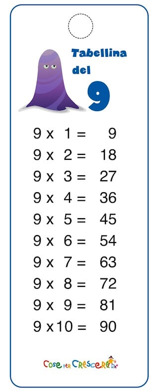 La tabellina del 9, da stampare, ritagliare e imparare. La tabellina del 9 è l’elenco dei risultati della moltiplicazione per 9 dei numeri da 1 a 10. La tabellina del nove compare all’interno della tavola pitagorica nella nona riga e nella nona colonna.