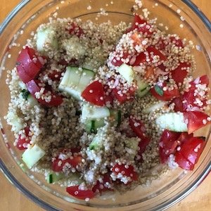 - Versare la quinoa in una ciotola capiente. Aggiungere i cipollotti, il cetriolo, i pomodorini, il prezzemolo, la menta e amalgamare delicatamente tutti gli ingredienti.