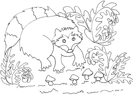 Un bel disegno di un procione che si diverte tra delle grandi felci, da stampare e colorare. ...
