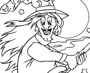Disegno da colorare della Befana che spicca il volo sulla sua scopa, portando un sacco colmo di caramelle, cioccolatini, dolcetti e… carbone? Ma solo dolce e buono da mangiare! ...