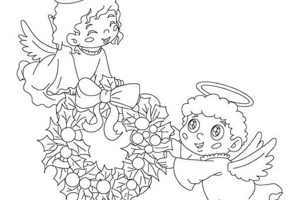 Due angioletti di Natale da colorare da stampare gratuitamente. Piccoli angeli che portano una bella corona di Natale. Un disegno da colorare per preparare Natale, adatto ai bambini che frequentano la scuola primaria e la scuola dell’infanzia. Disegno di angioletti ...