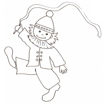Disegno di un bambino vestito da pagliaccio che gioca con un lungo nastro colorato, da stampare e colorare. ...