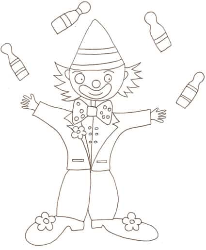 Disegno di un clown giocoliere, con quattro birilli! Un disegno da stampare e colorare gratuitamente. ...