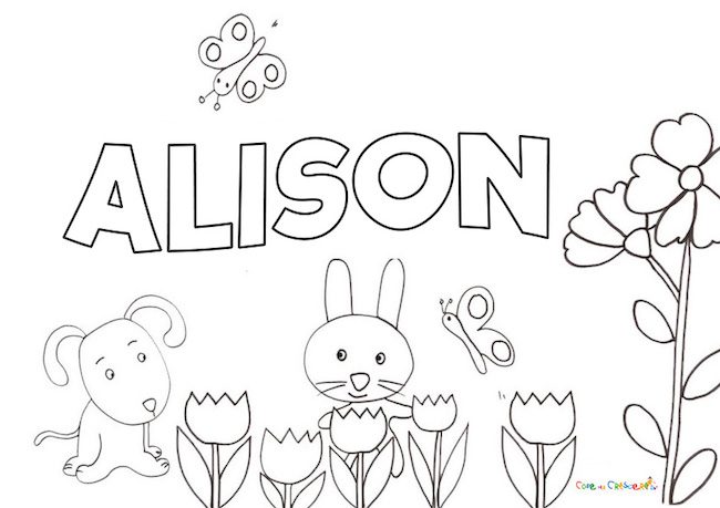 Il disegno del nome ALISON da colorare. Un disegno per bambini da stampare gratuitamente, da colorare per divertirsi con il proprio nome e impararne i caratteri. Per stampare il disegno, scorri la pagina verso il basso e clicca sul disegno dove ...